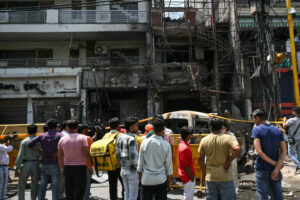 Men gather near the remains of an accident site a day after fire blazed through a children's hospital in New Delhi on May 26, 2024. Six newborn babies have died after a fire tore through a children's hospital in the Indian capital, with people charging into the flames to rescue the infants, police said on May 26. (Photo by Arun SANKAR / AFP) (Photo by ARUN SANKAR/AFP via Getty Images)